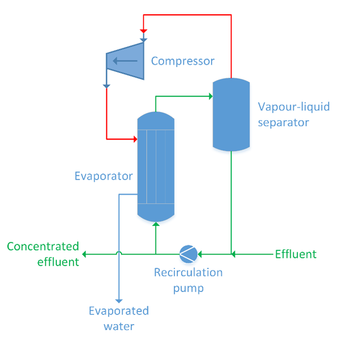 В MVR водяной пар, полученный в выпаривателе, поступает в компрессор, в котором происходит увеличение его давления и температуры. Далее пар используется в выпаривателе, но уже в качестве теплового источника энергии. Для работы данной установки необходим лишь один внешний источник электроэнергии для привода компрессора. В установке TVR, пар, полученный в котле, может смешиваться в термокомпрессоре с паром, полученным в выпаривателе; что способствует значительной экономии энергии.