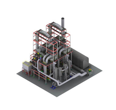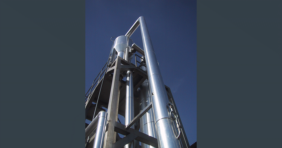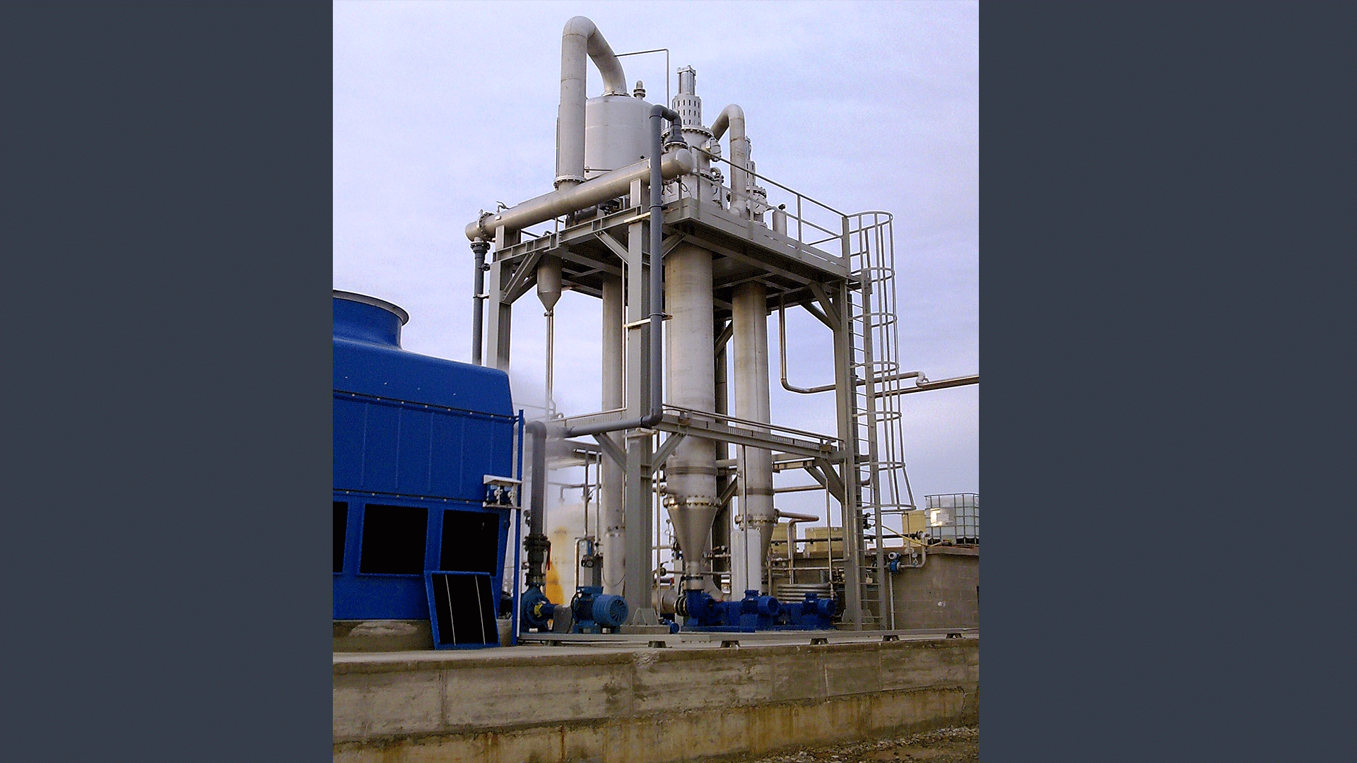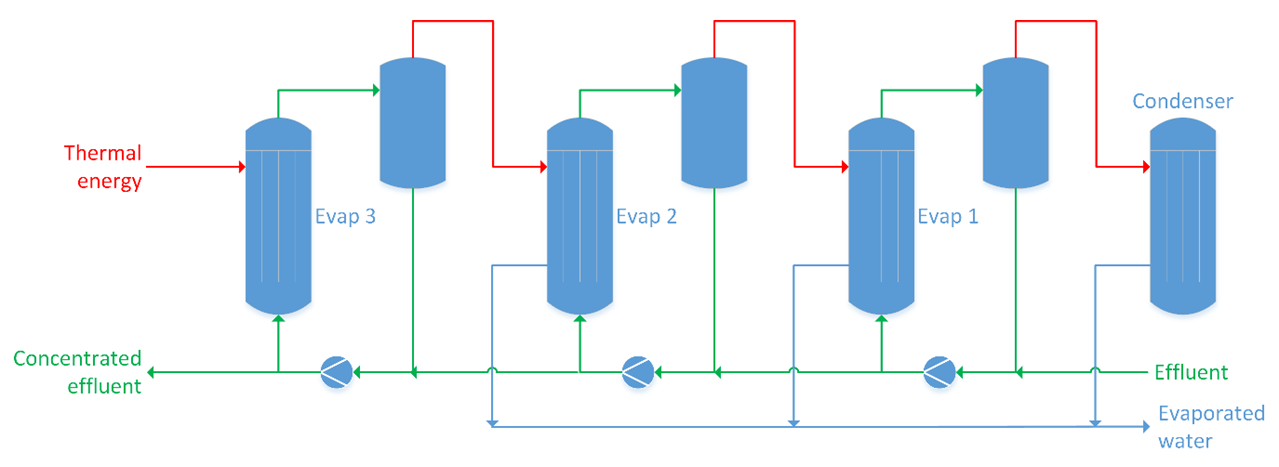 Эта установка включает в себя несколько ступеней (контуров) выпаривания. Пар, полученный в первом контуре, используется в качестве горячего теплоносителя на последующих. Таким образом, выстраивая последовательно несколько контуров, можно существенно уменьшить потребление энергии, необходимое для испарения требуемого количества воды.