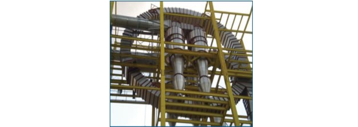 Сушилка с P-образным кольцом имеет классификатор (упрощенный коллектор), расположенный в верхней части сушильной колонны, где уже произведено 80% сушки, и температура сушки значительно снизилась.