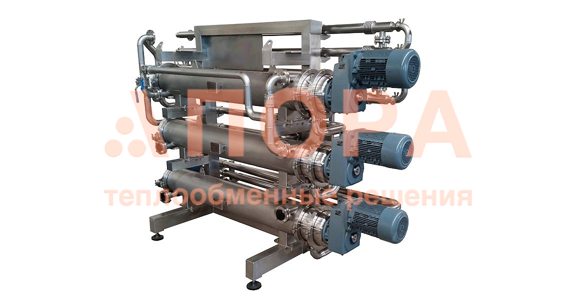 Скребковый теплообменник R-Серии ,разработан на основе кожухотрубного теплообменника и дополнен вращающимися скребками, расположенными в каждой внутренней трубке. Данные теплообменники применяются для обработки продуктов с высокой вязкостью и одновременно очищают стенки труб по которым течет продукт.
