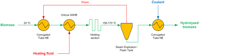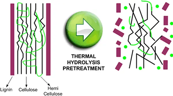 Термический гидролиз представляет собой процесс, в котором длинные цепные молекулы, которые образуют целлюлозу и гемицеллюлозу, распадаются и водной среде. В результате получаются составные части цепных молекул. Этот процесс интересен тем, что является экономически целесообразным способом предварительной обработки биомассы перед получением этанола или биогаза.
