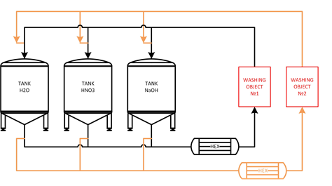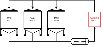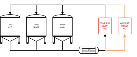 Обычно CIP-мойка включает 3 резервуара: для раствора щелочи, кислоты и чистой воды. Мойка оборудования осуществляется путем циркуляции моющего средства через него с последующим ополаскиванием водой. Процесс мойки можно описать следующим образом: моющее средство или вода покидает емкость (TANK), проходит через теплообменник (HEX), где нагревается до заданной температуры, и поступает в объект мойки (WASHING OBJECT), затем возвращается в емкость. Схема такой системы изображена на рис. 1.