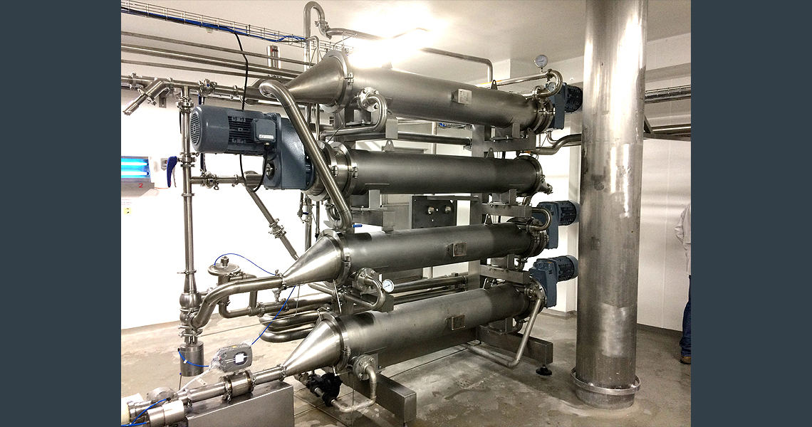 Теплообменник с возвратно-поступательным движением скребков, подходит для работы в сложных условиях, обработки вязких продуктов, которые склонны к загрязнению теплообменной поверхности или образованию нагара. Пилотная модель имеет три внутренние трубки и поверхность теплообмена 1,1 м2, модель U 3/3 154/60 2.0 304/316L, В нашей компании можно арендовать скребковый теплобменник R серии и Unicus серии.
